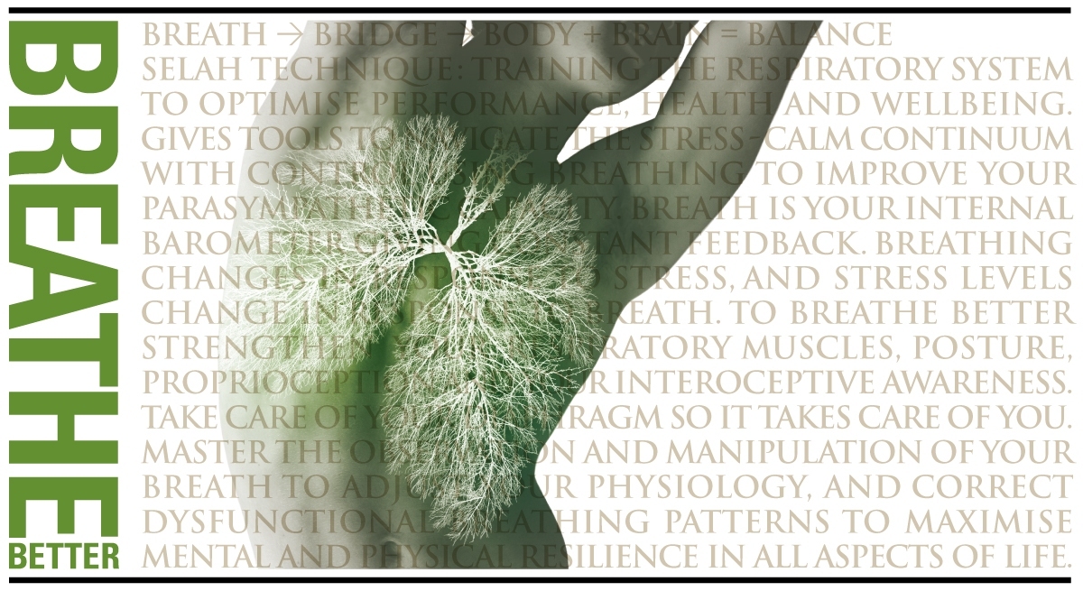 Breath > Bridge > Body + Brain = Balance. Selah technique: training the respiratory system to optimise performance, health and wellbeing. Gives tools to navigate the Stress - Calm Continuum with control using breathing to improve your parasympathetic capacity. Breath is your internal barometer giving constant feedback. Breathing changes in response to stress, and stress levels change in response to breath. To breathe better strengthen your respiratory muscles, posture, proprioception and your interoceptive awareness. Take care of your diaphragm so it takes care of you. Master the observation and manipulation of your breath to adjust your physiology, and correct dysfunctional breathing patterns to maximise mental and physical resilience in all aspects of life.
