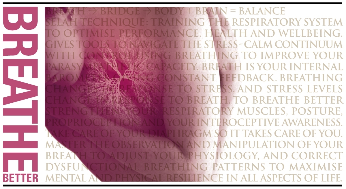 Central to her work Anna has developed The Selah Technique: (Breath > Bridge > Body + Brain = Balance) The Selah Technique which is both holistic and evidence based, maximises physical and emotional resilience and assists in navigating the Stress-Calm Continuum. The Selah Technique strengthens respiratory muscles, postural and interoceptive awareness, corrects dysfunctional breathing patterns and improves parasympathetic capacity for performance and recovery.